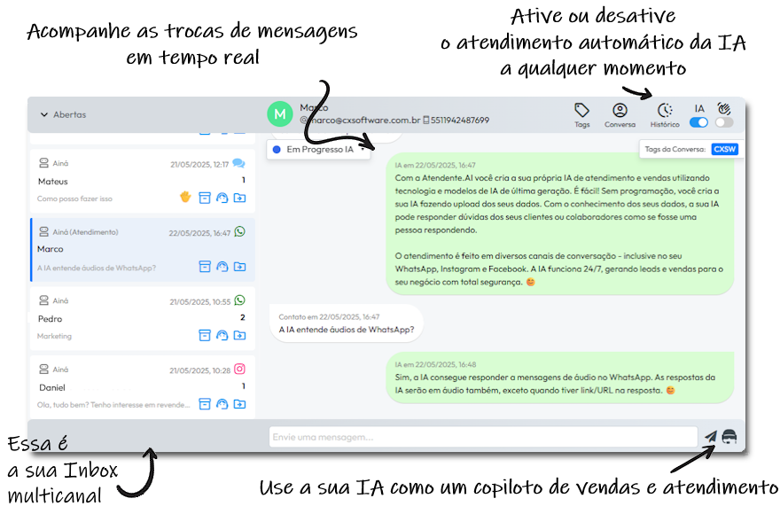 Com a nossa plataforma você atende os seus clientes em diversos canais de forma centralizada ou deixa a IA atendendo quando não estiver online.
